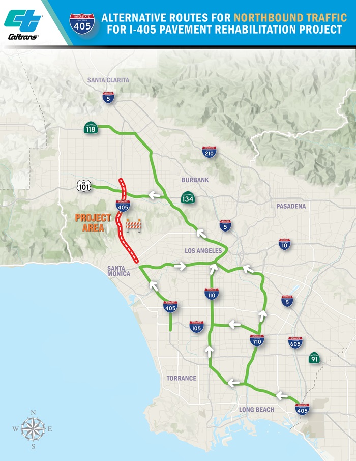 The improvements will extend along I-405 from Victory Boulevard in the San Fernando Valley to Wilshire Boulevard in West Los Angeles, which is an essential commuter corridor from northern Los Angeles County and the San Fernando Valley to the Westside, Los Angeles International Airport, the South Bay cities and Orange County. Pavement will be rehabilitated along approximately 92 lane miles including replacing sections between Victory Boulevard and Mulholland Drive and repairing sections of other lanes along I-405 between the project limits. These renovations are planned to enhance motorist’s safety, ride quality, and mobility along this stretch of roadway.